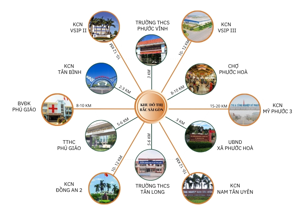- Trong vòng 15-20 phút: Có mặt tại Trường Đại học Quốc tế Miền Đông và lõi trung tâm thành phố mới Bình Dương.